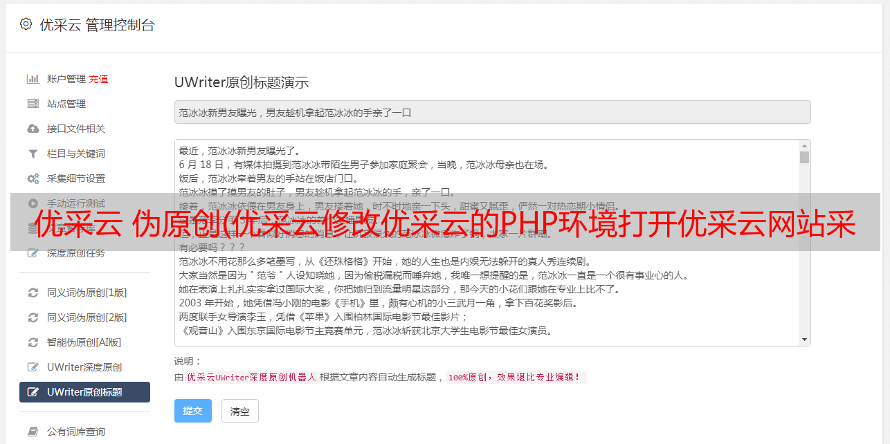 优采云伪原创插件是一款非常实用的采集+伪原创工具,可以添加多种替换方式,基本实现文字的深度操作伪原创 ,秒杀市面上大部分的 伪原创 工具。该软件是纯PHP代码,需要配合编辑器使用。可用于采集的文章的快速伪原创,非常适合文章的辅助编辑,可用于各种新闻信息的采集 ,并在没有灵感的时候辅助修改文章内容,提高工作效率。