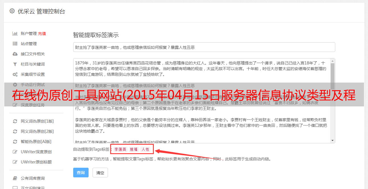 优采云 发布时间: 2022-03-19 14:14在线伪原创工具网站(2015年04月15日服务器信息协议类型及程序支持)