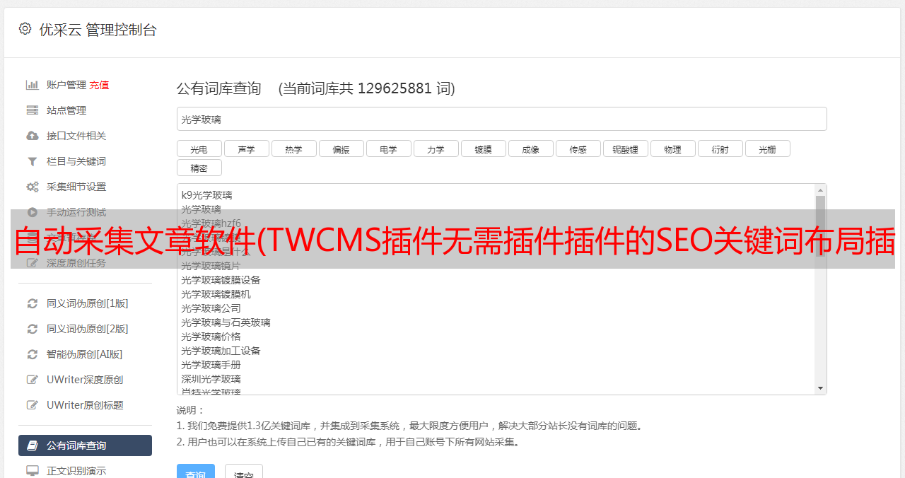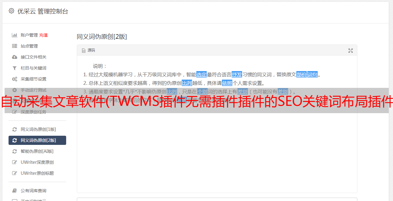 优采云 发布时间: 2022-03-20 05:13自动采集文章软件(TWCMS插件无需插件插件的SEO关键词布局插件