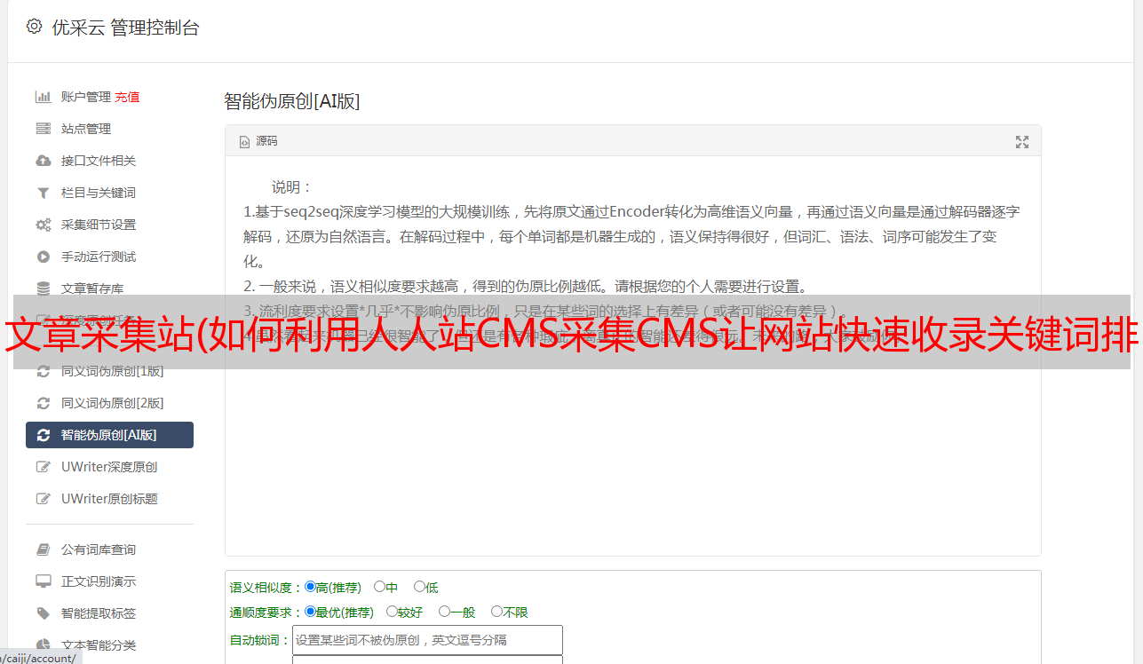 本人人站cms采集无需学习更多专业技能,简单几步即可轻松采集内容数据,用户只需在人人站cms对采集进行简单设置,完成后人人站cms采集会根据用户设置的关键词进行内容和图片的高精度匹配。您可以选择在伪原创之后发布,提供方便快捷的内容采集伪原创发布服务!!