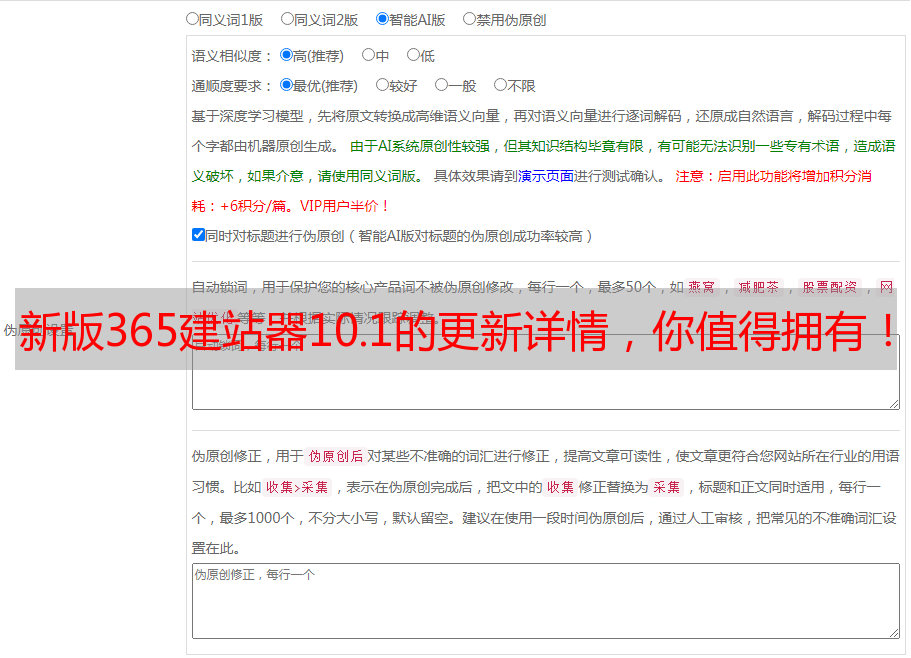 我要感谢365 站群系统的用户的建议和反馈。我们花了很长时间来更新站群软件。大多数用户的建议和问题已解决。让我们来看看。查看新版本的365 Site Builder 1 0. 1的更新详细信息!