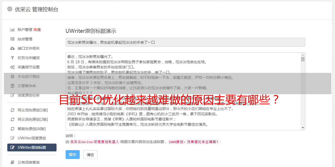 1、主题明确,更容易宣传自己的优势资源,并强调领域的本质; 2、 网站保持统一的内容方向,可以聚集一群粉丝,而我不需要粉丝的力量在这里传播。写更多; 3、对于搜索引擎而言,通过增强语义分析功能,可以更轻松地在早期获得主题明确的搜索引擎的信任网站,即使这样,它也可以缩短新网站的索引时间是一个很小的影响因素,您没有理由不执行它。
