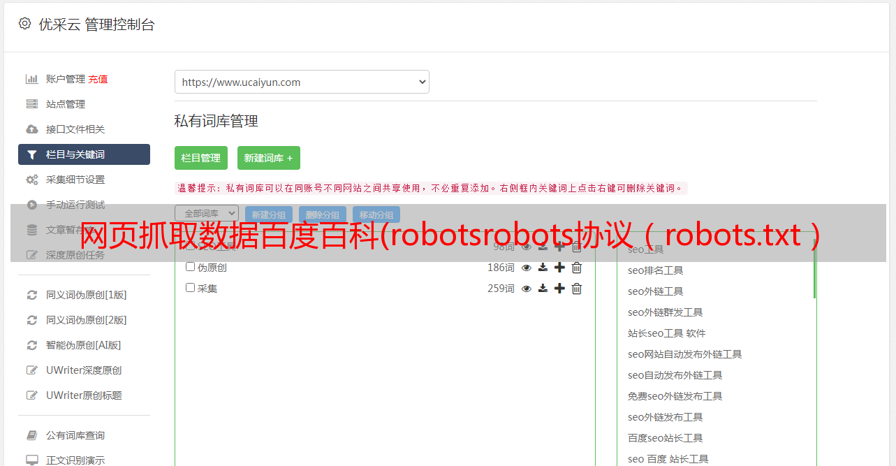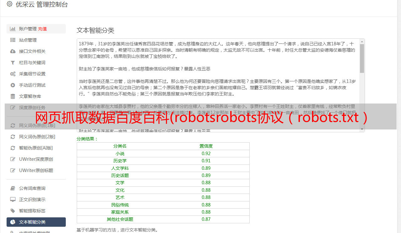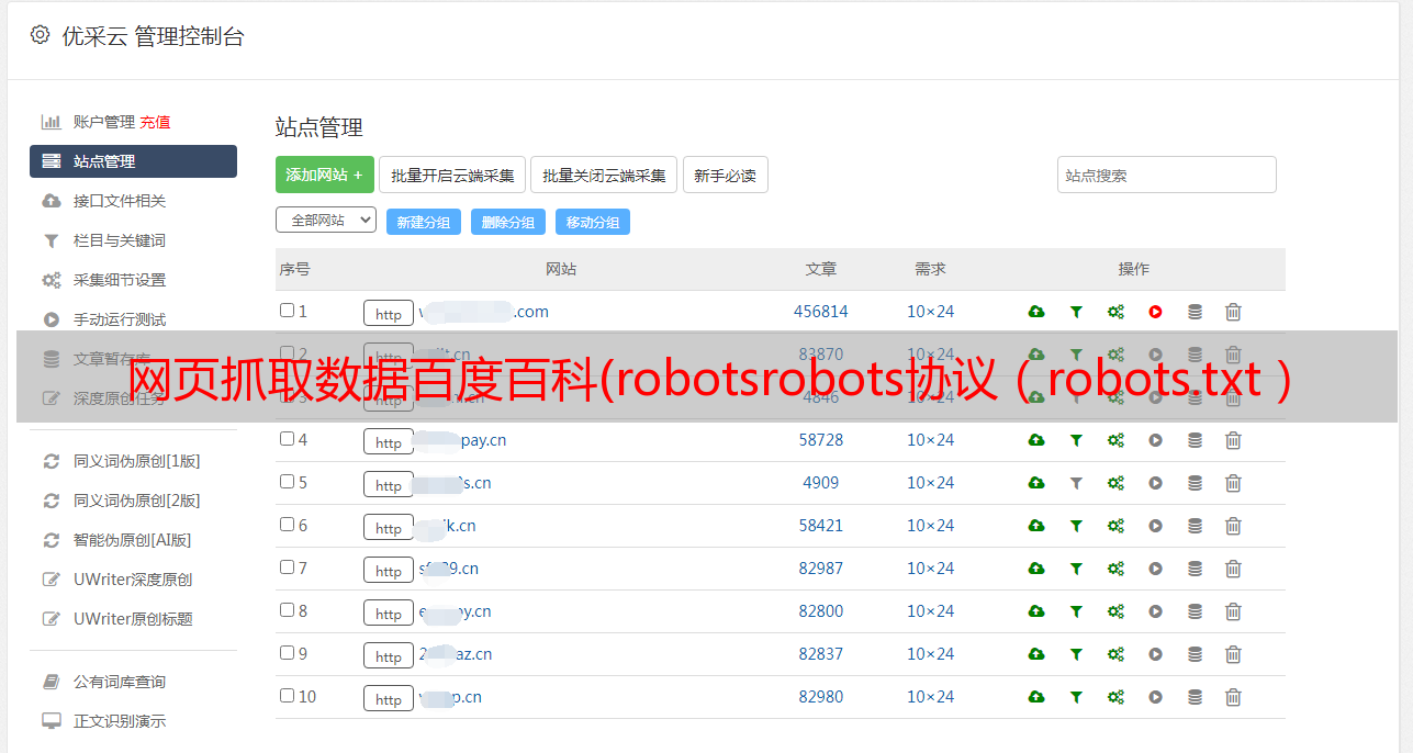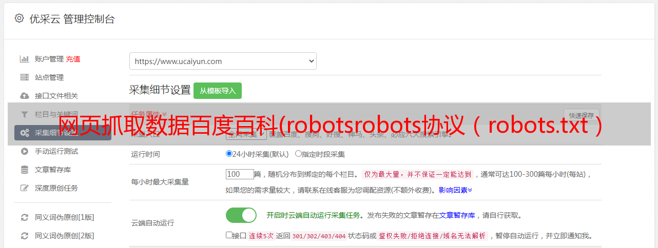 优采云 发布时间: 2022-03-24 10:02网页抓取数据百度百科(robotsrobots协议(robots.txt)Robots协议用来告知搜索引擎哪些页面能被抓取)
