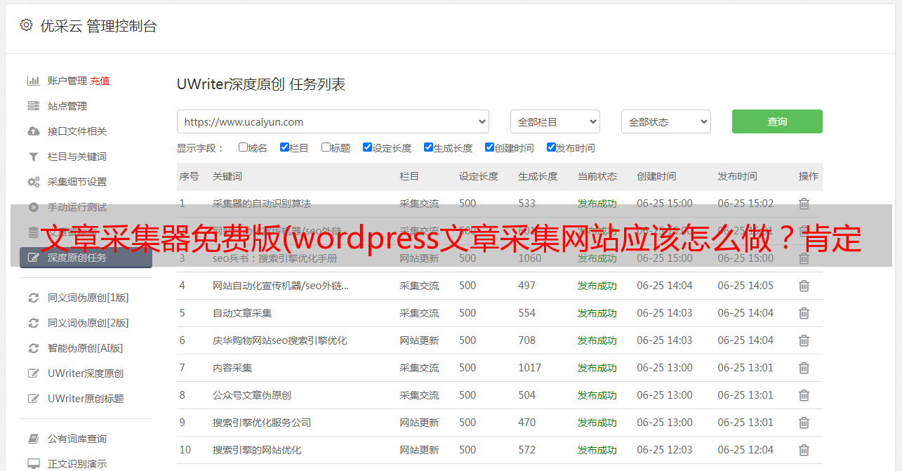 wordpress文章采集插件拥有完善的内容创作功能,可以挖掘流量词。伪原创时间关键词插入、图片插入和图片水印。文章支持发布后向搜索引擎推送链接。