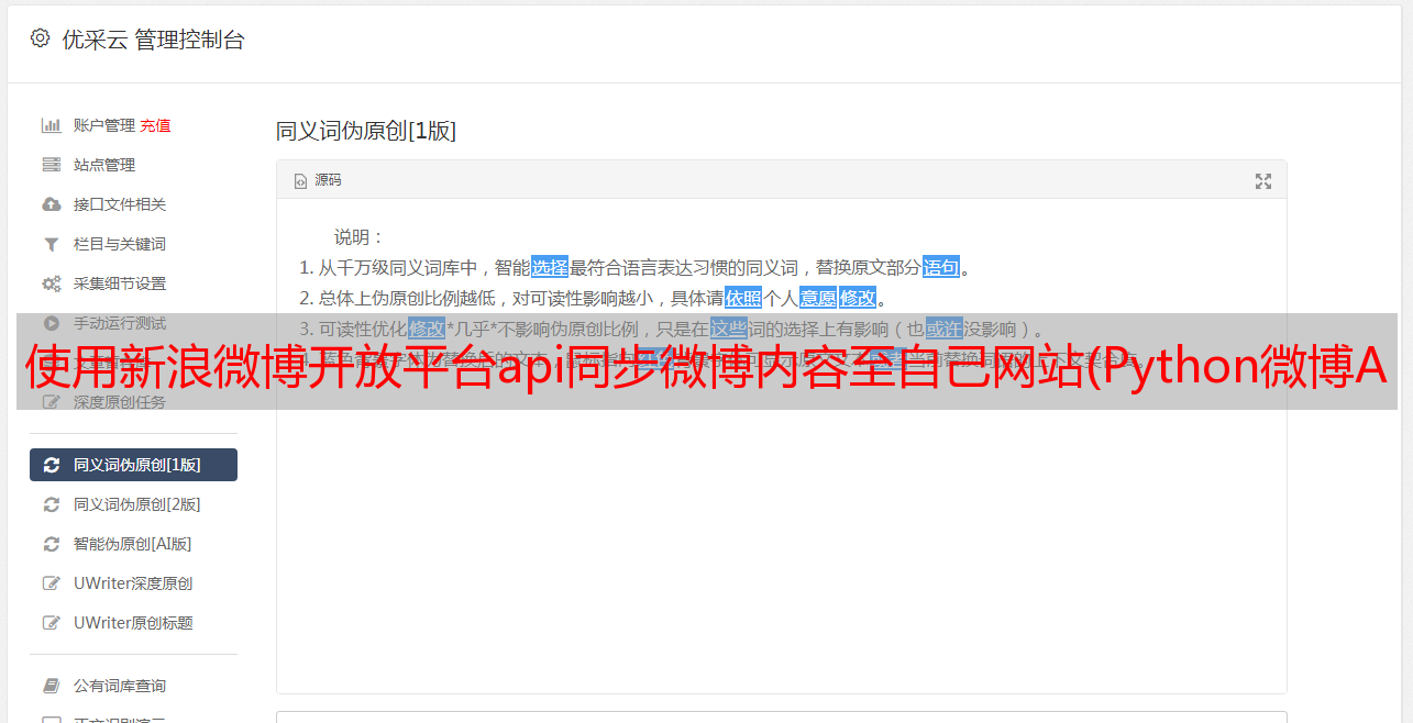 优采云 发布时间: 2022-03-26 21:19使用新浪微博开放平台api同步微博内容至自己网站(Python微博API获取微博内容作者:更多优惠gt(组图))