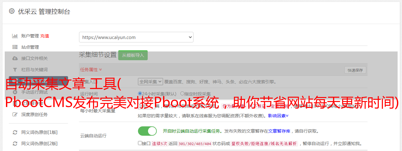 Pbootcms发布完美连接Pboot系统,只要你的网站被Pbootcms建立,网站就可以实现一键文章采集伪原创发布,不修改任何代码,创建好发布任务,无需人工干预,每天智能发布文章,大大提升网站百度采集,网站优化增加翅膀。