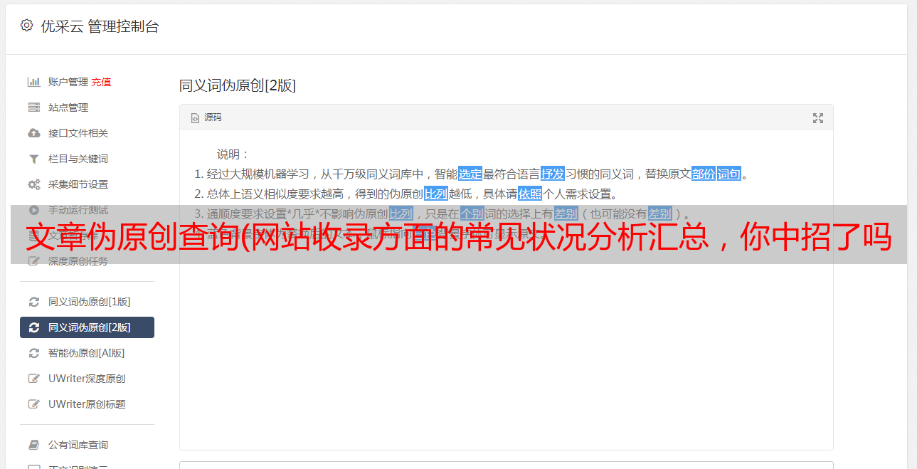 优采云 发布时间: 2022-03-28 21:28文章伪原创查询(网站收录方面的常见状况分析汇总,你中招了吗?)