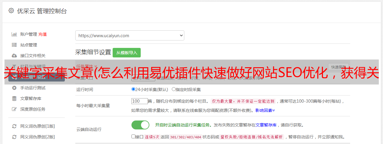1、通过易友插件生成行业相关词,关键词从下拉词、相关搜索词、长尾词。可以设置自动删除不相关的词。通过EasyYou插件自动采集行业相关文章,一次可以创建几十个或者几百个采集任务,可以同时执行多个域名任务采集。