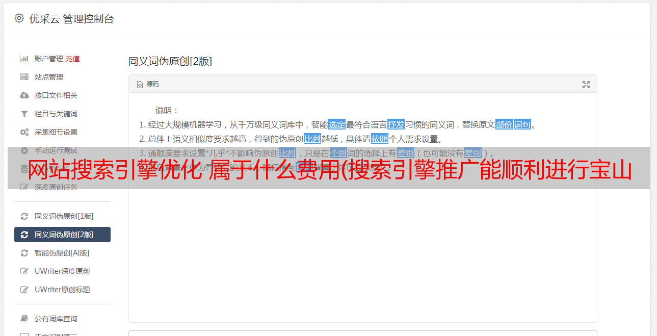 优采云 发布时间: 2022-04-01 04:04网站搜索引擎优化 属于什么费用(搜索引擎推广能顺利进行宝山区优化选哪家些目标做排名优化)