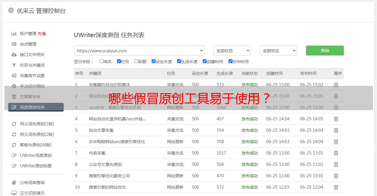 优采云 发布时间: 2020-08-06 17:05在日常优化过程中,网站管理员需要同时管理多个网站,因此没有时间或精力来编写更多原创内容. 这时,您需要使用伪原创工具来更新内容. 为此,比较实用的伪原创工具主要包括: 网站管理员圈子中使用的史青,优采云,魔术,战神等.
