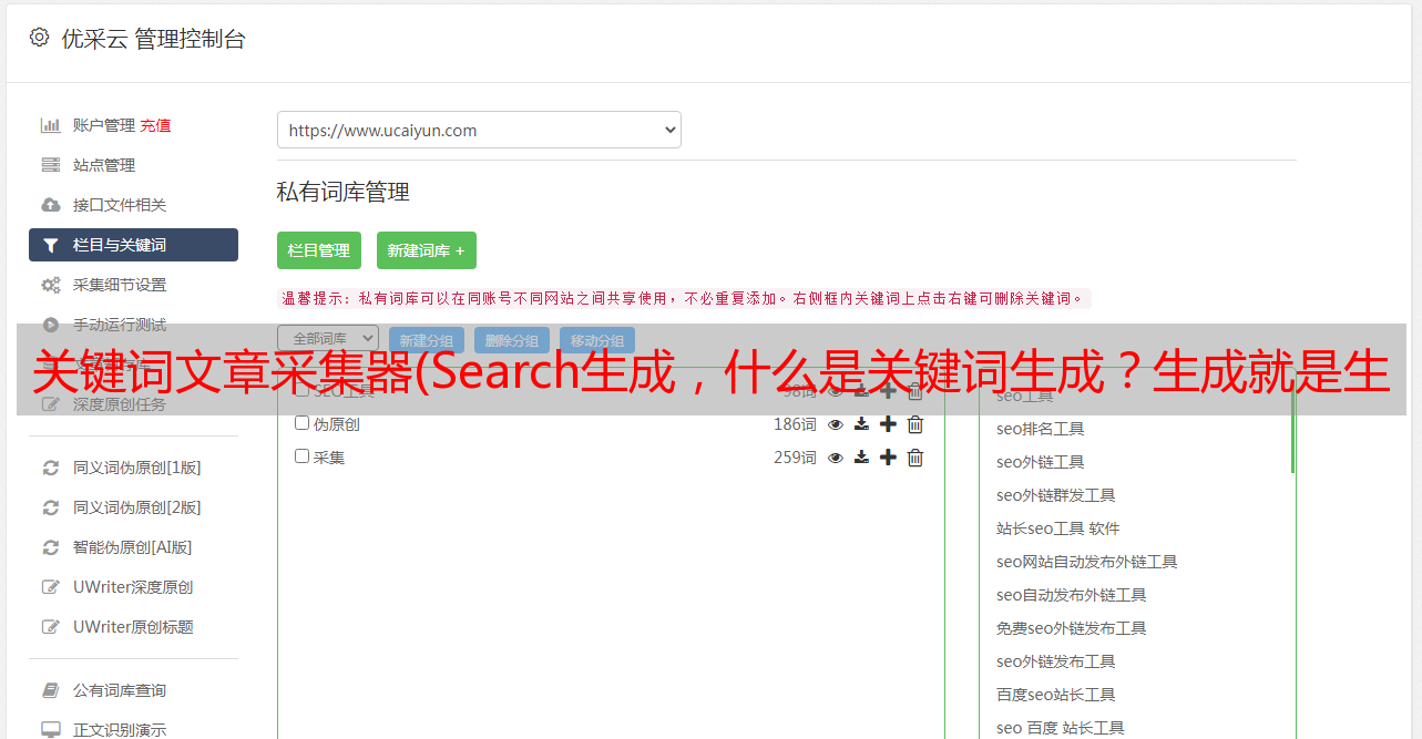 本工具是一款一体化的内容处理工具:自动采集关键词+文章采集和生成+伪原创和智能写作+自动发布到网站和自媒体平台+网站批量管理+自动推送到搜索引擎收录,详情见图(一、二、三、四)