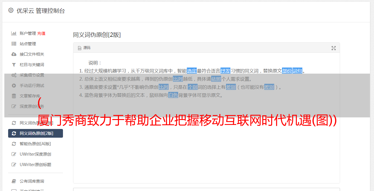厦门秀商凭借丰富可靠的经验、强大的互联网技术、24小时智能客服在线咨询的售后服务,为各行各业提供了完善的企业搜索引擎排名,赢得了良好的口碑和广泛的支持。通过多年的企业搜索引擎排名经验和成功案例,总结出一套系统有效的推广优化方案,可以帮助企业建立自己的网络营销利润体系,提高网络科技时代的市场竞争力. .