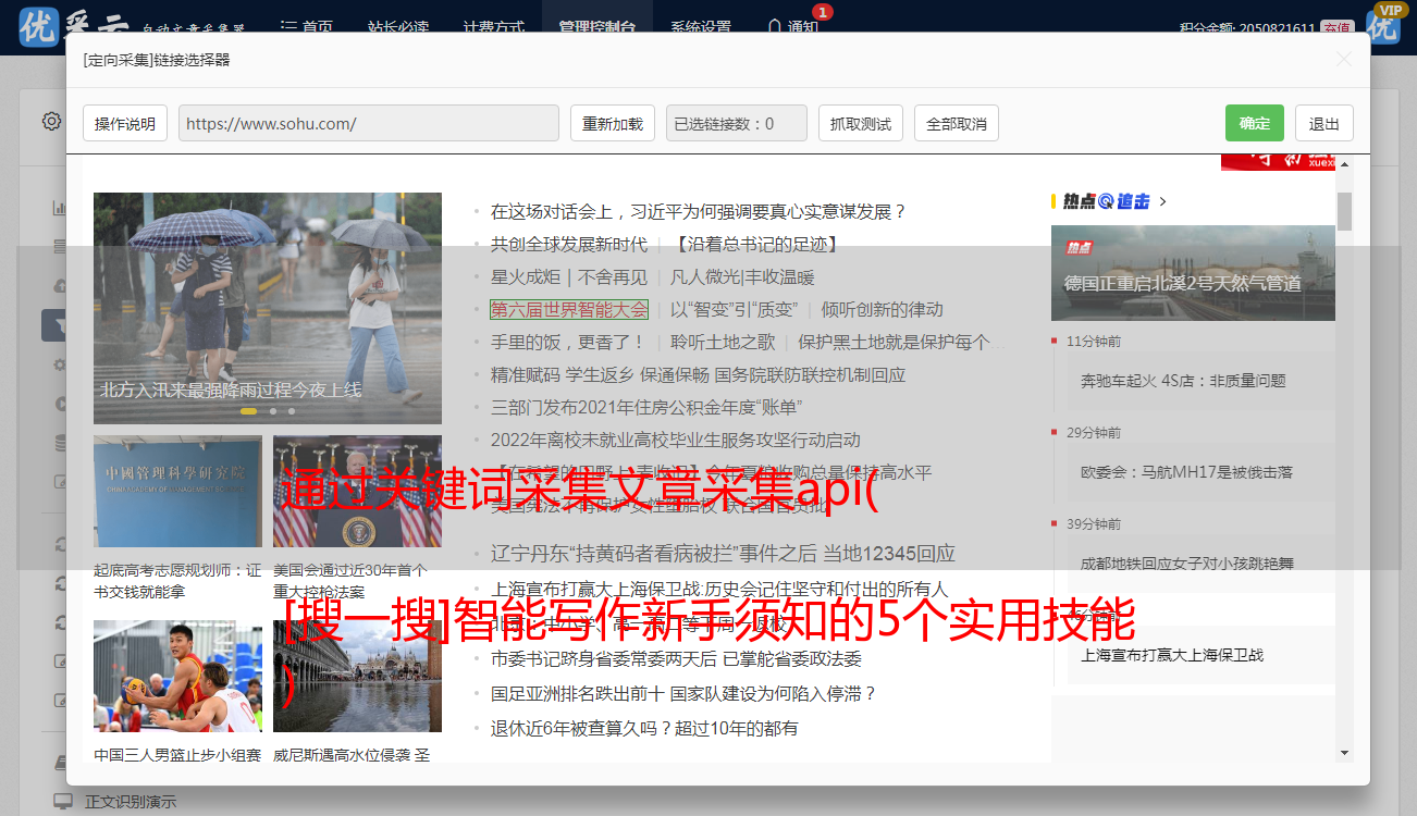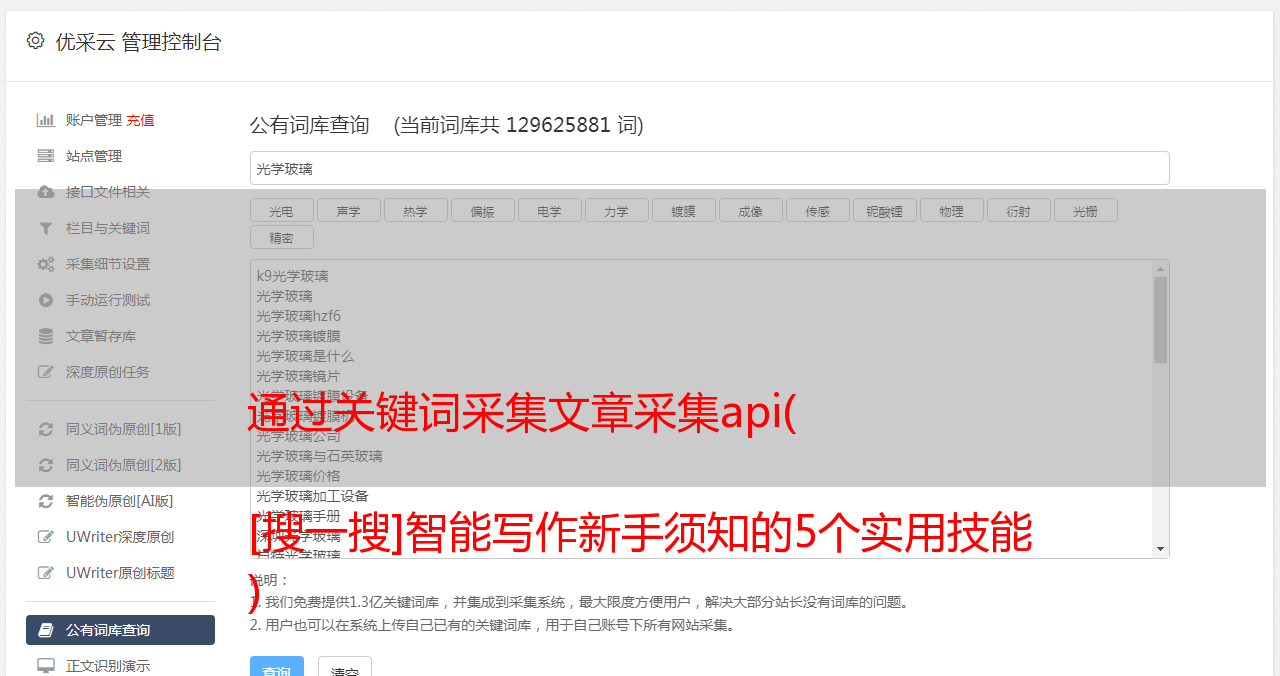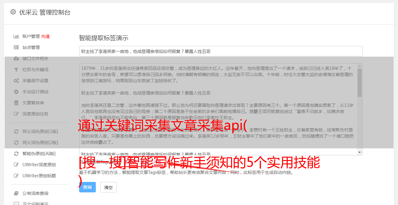1、文章采集,打开界面,可以看到顶部有文章采集选项,点击进入关键词,可以进入任何你想要的表达方式,只需输入一两个词即可自动生成专业的文章。