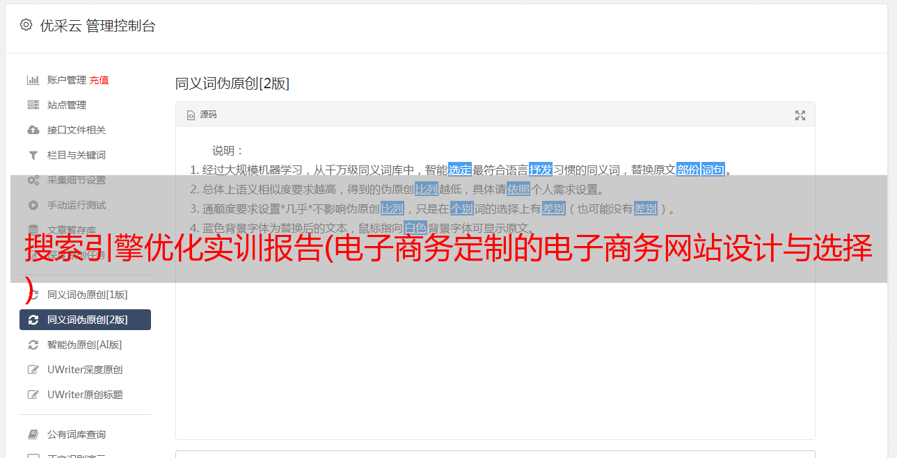 优采云 发布时间: 2022-04-11 17:23搜索引擎优化实训报告(电子商务定制的电子商务网站设计与选择