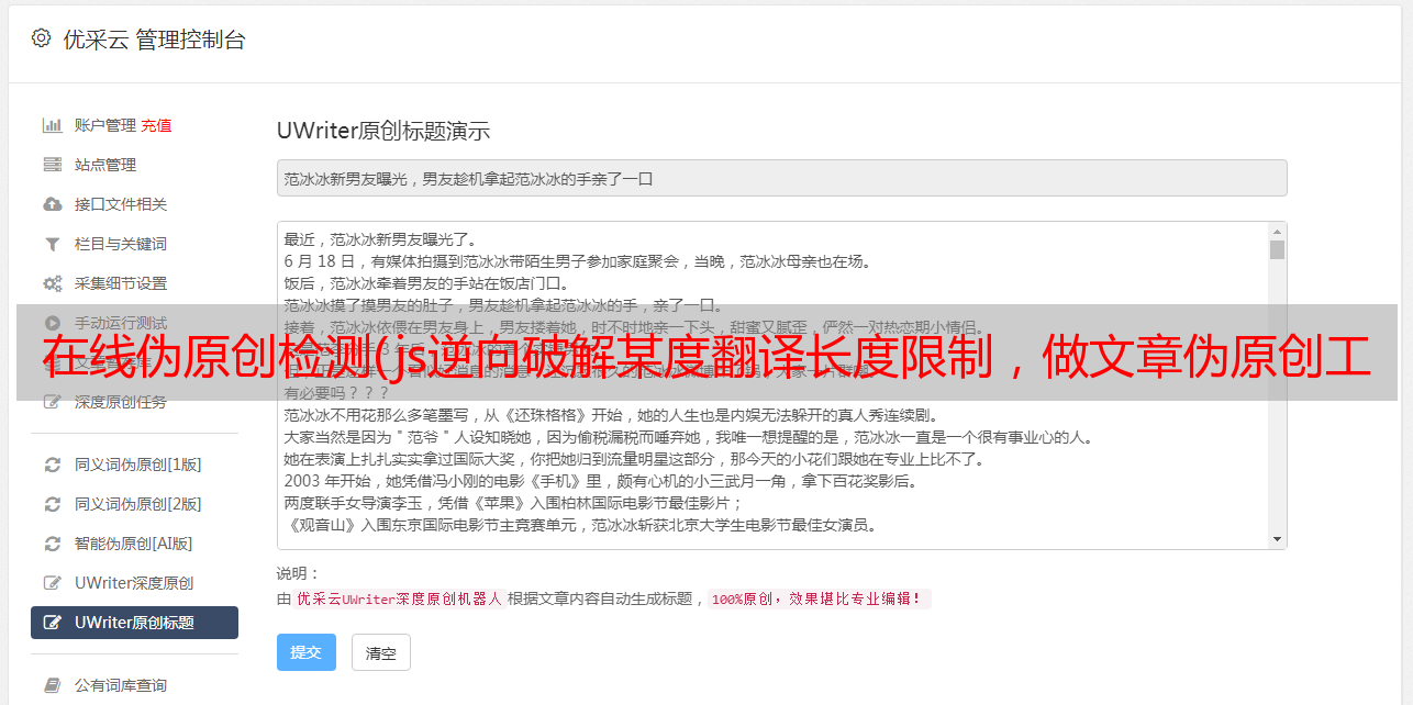 优采云 发布时间: 2022-04-13 22:25在线伪原创检测(js逆向破解某度翻译长度限制,做文章伪原创工具伪)