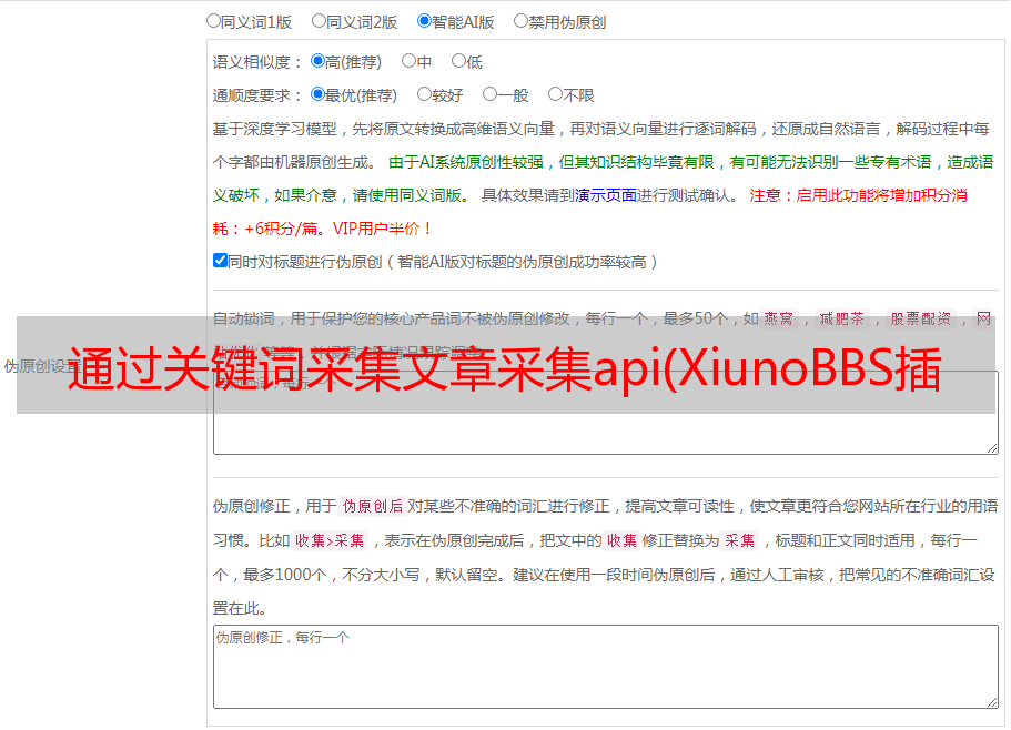 XiunoBBS插件拥有非常强大的NLP自然语言处理系统。通过领先的技术,我们的伪原创文章可以在保持原创度的同时保持良好的可读性。通过我们的段落文章插入、相关词替换、删除敏感字段(比如我们可以删除带有作者、出处等敏感信息的段落),让我们的文章与我们的网站主题更相关。