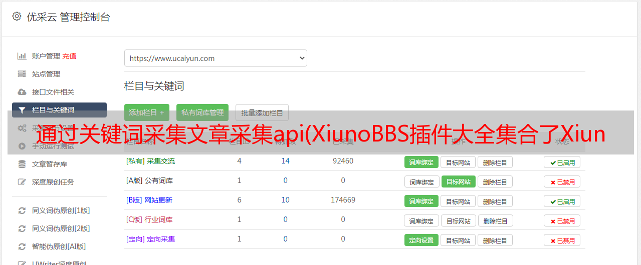 XiunoBBS插件合集集成了XiunoBBS内容管理的全流程,XiunoBBS插件通过XiunoBBS关键词匹配内容采集,自动文章标签图片水印等内容优化,然后通过集成的伪原创发布,最后自动将URL推送到搜索引擎平台,实现对XiunoBBS内容的全流程管理。