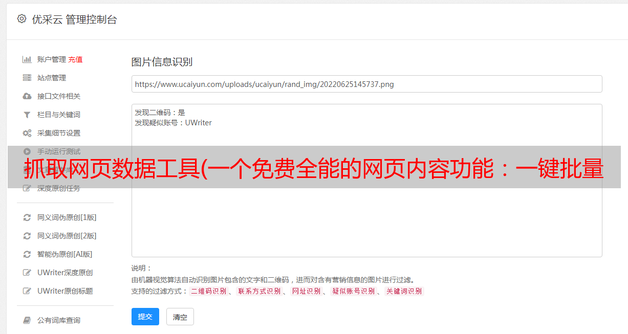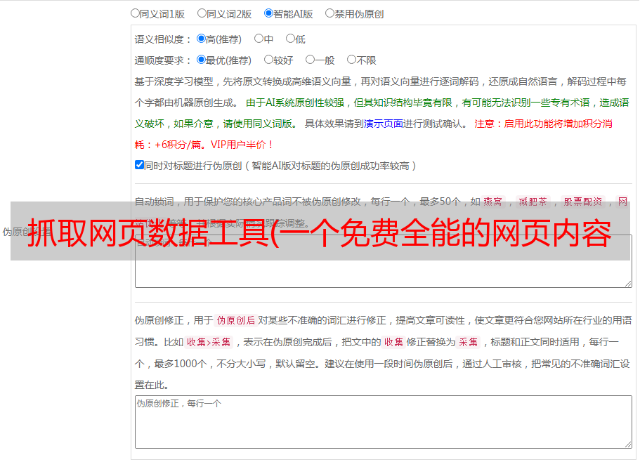 网页内容抓取,什么是网站内容抓取?就是一键批量抓取网站的内容。只需要输入域名即可抓取网站的内容。今天给大家分享一个免费的全能网页内容抓取功能:一键抓取网站内容+自动伪原创+主动推送到搜索引擎收录(参考图片详情一、二、三、四、五)@ >