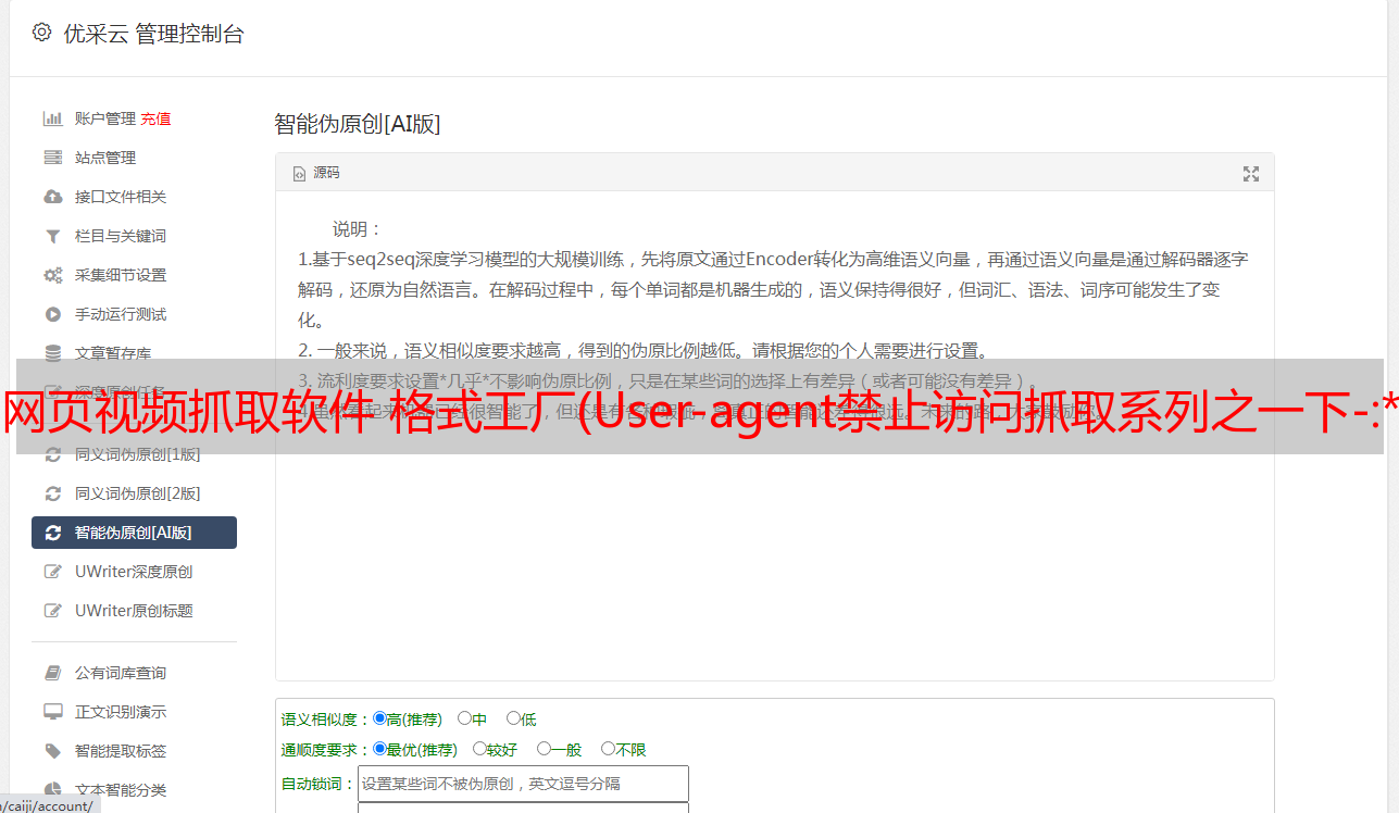 优采云 发布时间: 2022-04-20 02:19网页视频抓取软件 格式工厂(User-agent禁止访问抓取系列之一下-:*
