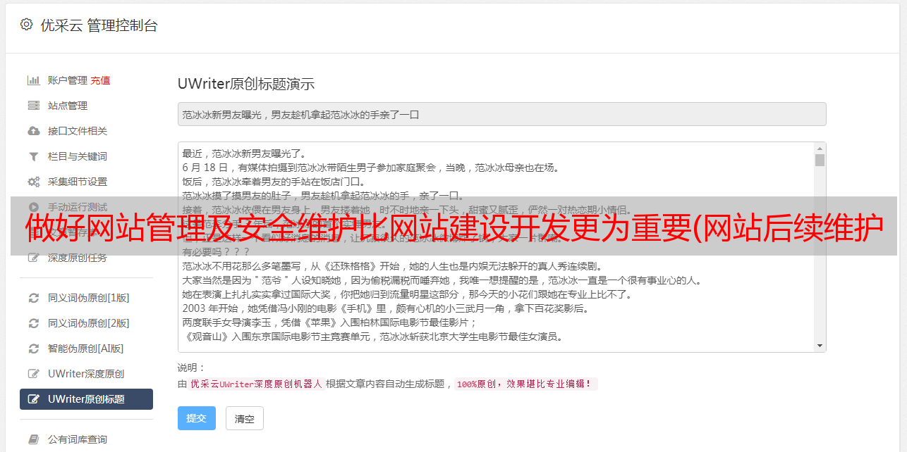 优采云 发布时间: 2022-04-29 04:01做好网站管理及安全维护比网站建设开发更为重要(网站后续维护应该怎样做)