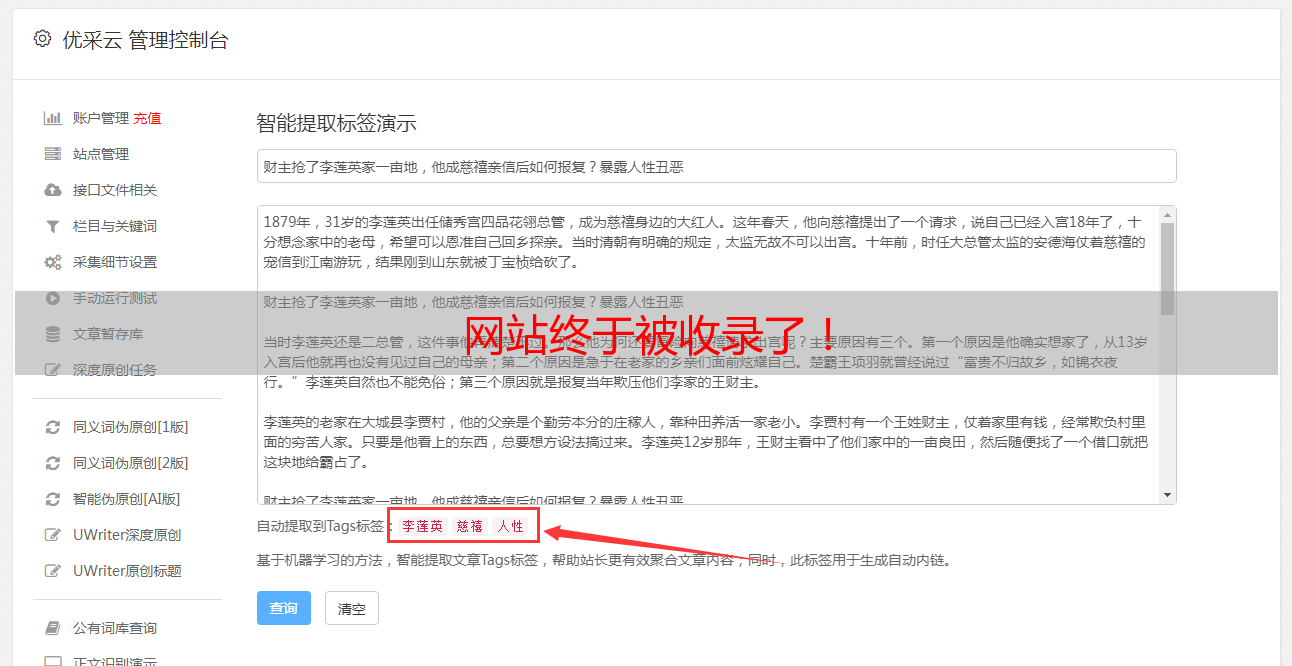优采云 发布时间: 2022-04-30 08:30网站终于被收录了!
