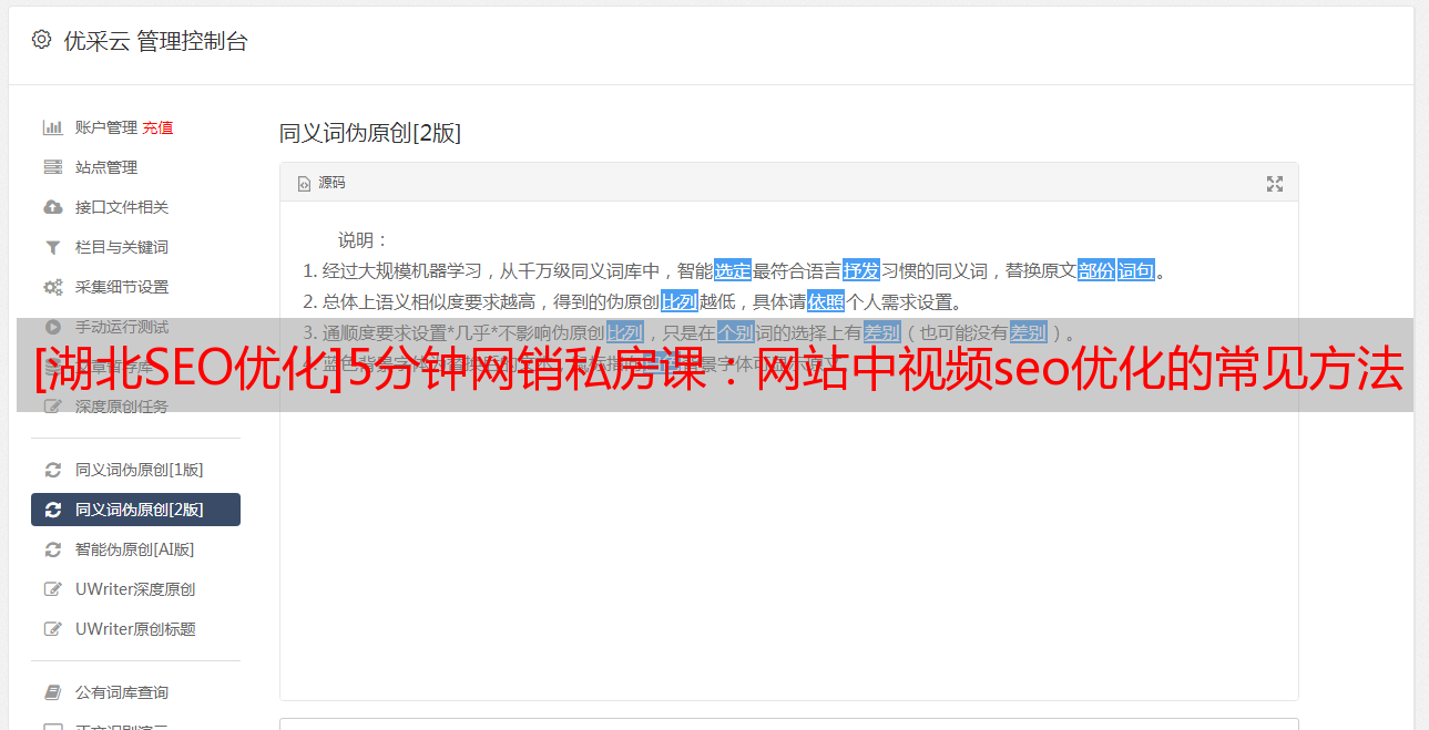 优采云 发布时间: 2022-05-01 02:36[湖北SEO优化]5分钟网销私房课:网站中视频seo优化的常见方法