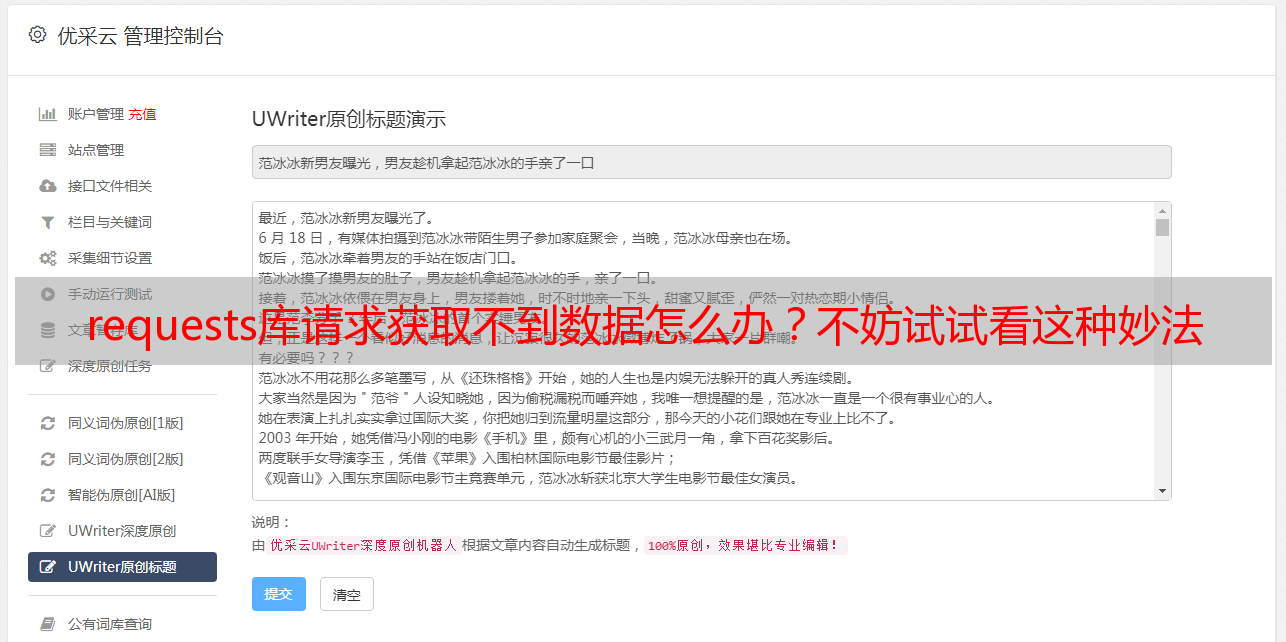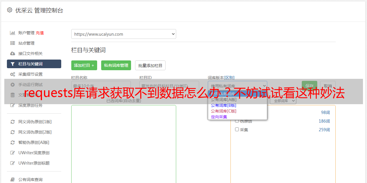 优采云 发布时间: 2022-05-11 12:03requests库请求获取不到数据怎么办?不妨试试看这种妙法