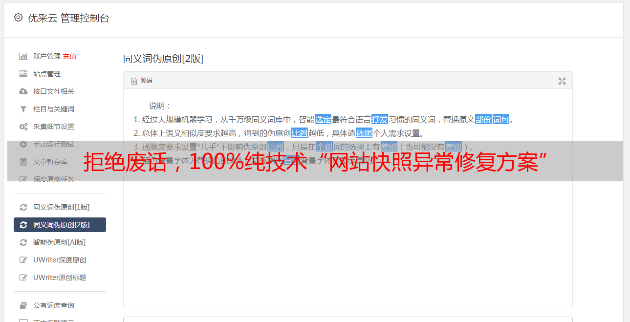 优采云 发布时间: 2022-05-19 17:59拒绝废话,100%纯技术“网站快照异常修复方案”