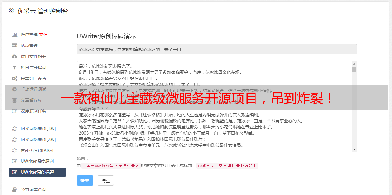 优采云 发布时间: 2022-05-23 10:52一款神仙儿宝藏级微服务开源项目,吊到炸裂!