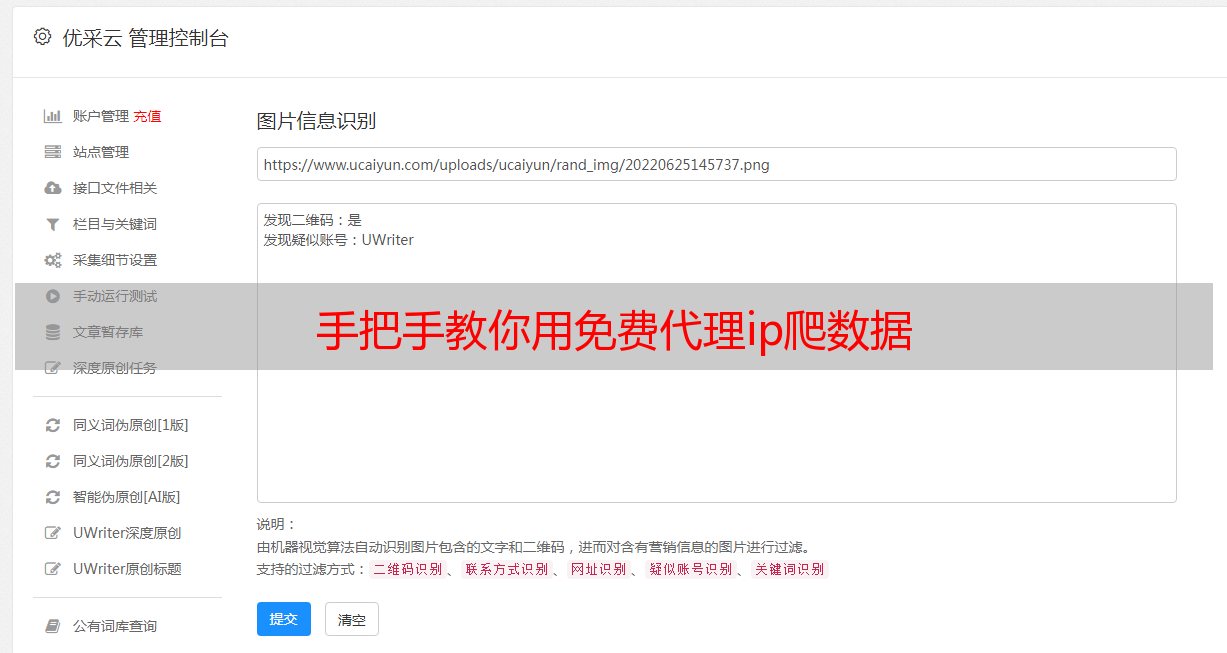 4、其中for循环是遍历所有优采云站,try是用于检测该ip还能不能用,若不能,则在except里请求1个新ip,爬取效果如下图所示:
