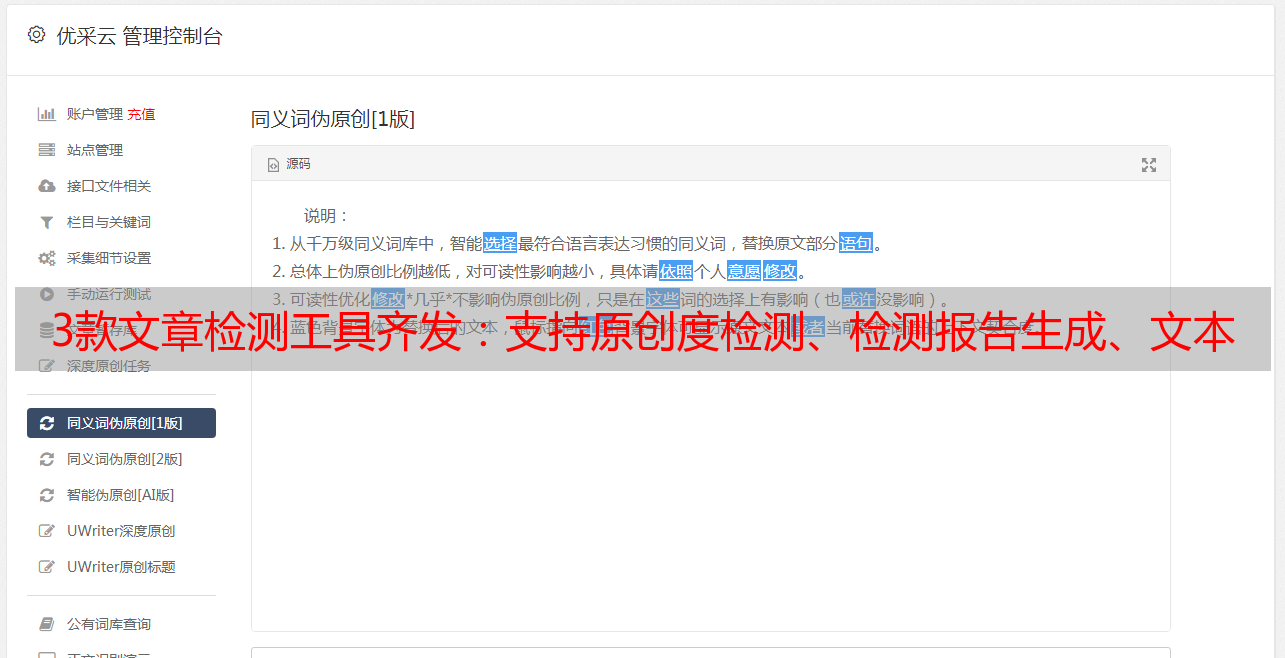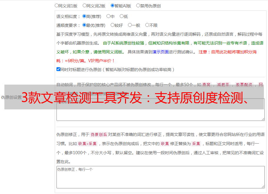 这个工具跟上面的工具属于一类型,都是基于百度蜘蛛算法开发的工具,也就是说,你需要检测的文章只能跟全网互联网公开内容进行比对,这一特征非常适合对付网文类自媒体平台的检测系统。