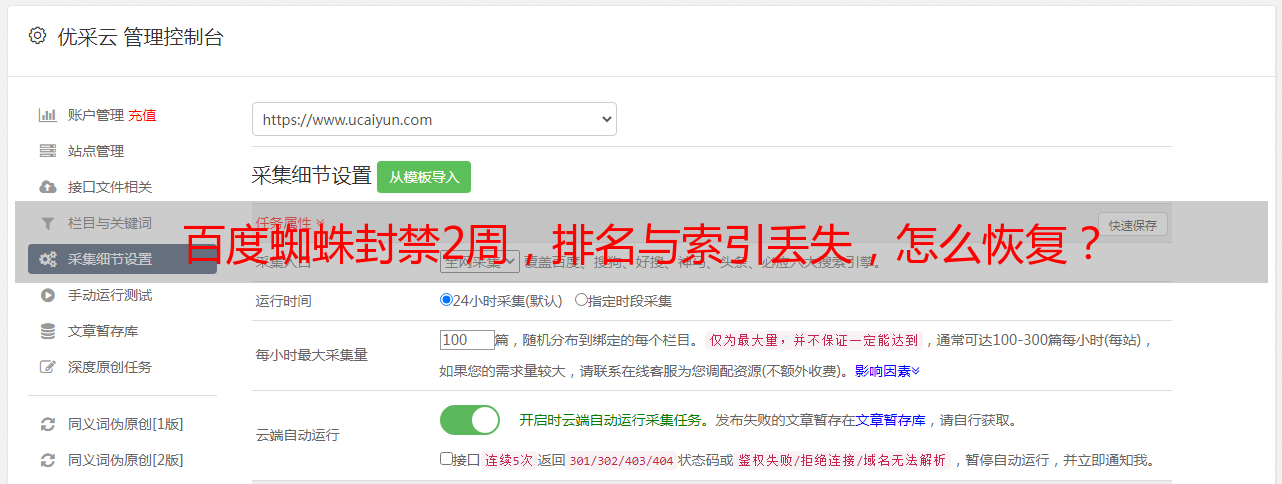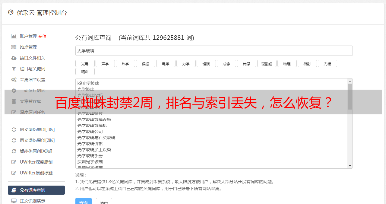 优采云 发布时间: 2022-06-02 13:12百度蜘蛛封禁2周,排名与索引丢失,怎么恢复?