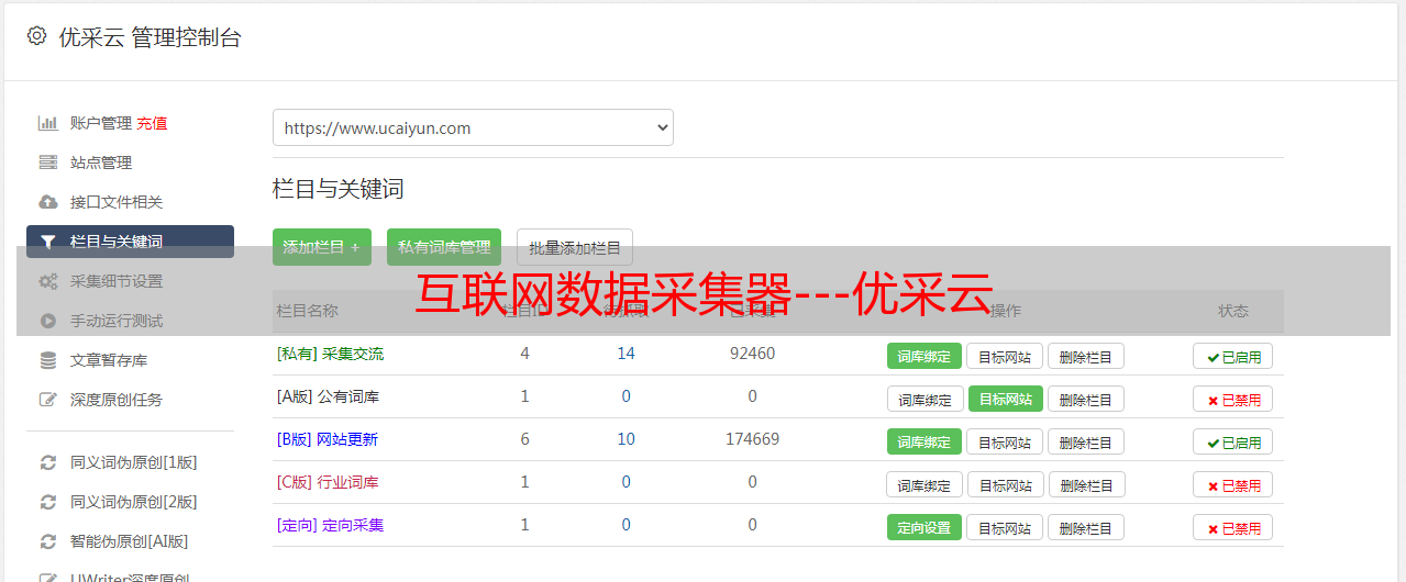 优采云数据采集系统以完全自主研发的分布式云计算平台为核心,可以在很短的时间内,轻松从各种不同的网站或者网页获取大量的规范化数据,帮助任何需要从网页获取信息的客户实现数据自动化采集,编辑,规范化,摆脱对人工搜索及收集数据的依赖,从而降低获取信息的成本,提高效率。
