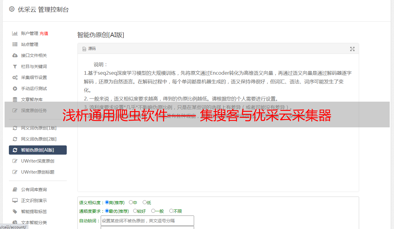 最近想用爬虫软件来采集网页上的一些数据,根据百度的推荐以及相关关键词查询,找到了两款软件:“集搜客”和“优采云”,两款软件都有可视化界面,对于编程思维比较薄弱的用户来说,这两款软件上手容易,操作简单易懂。今天就带大家来了解对比一下这两款通用的网络爬虫软件。