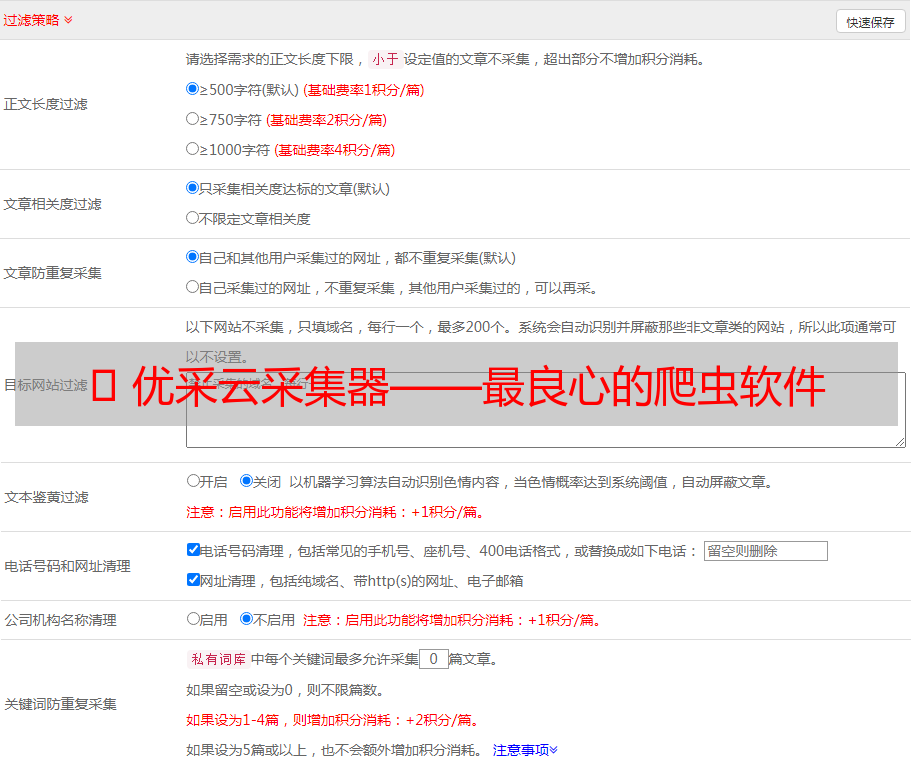 相比之下,优采云采集器提供了更多的功能:强大的过滤配置,完整的正则功能和全面的文字处理配置。当然,功能强大的同时也带来了复杂度的提升,需要有更多的耐心去学习使用。
