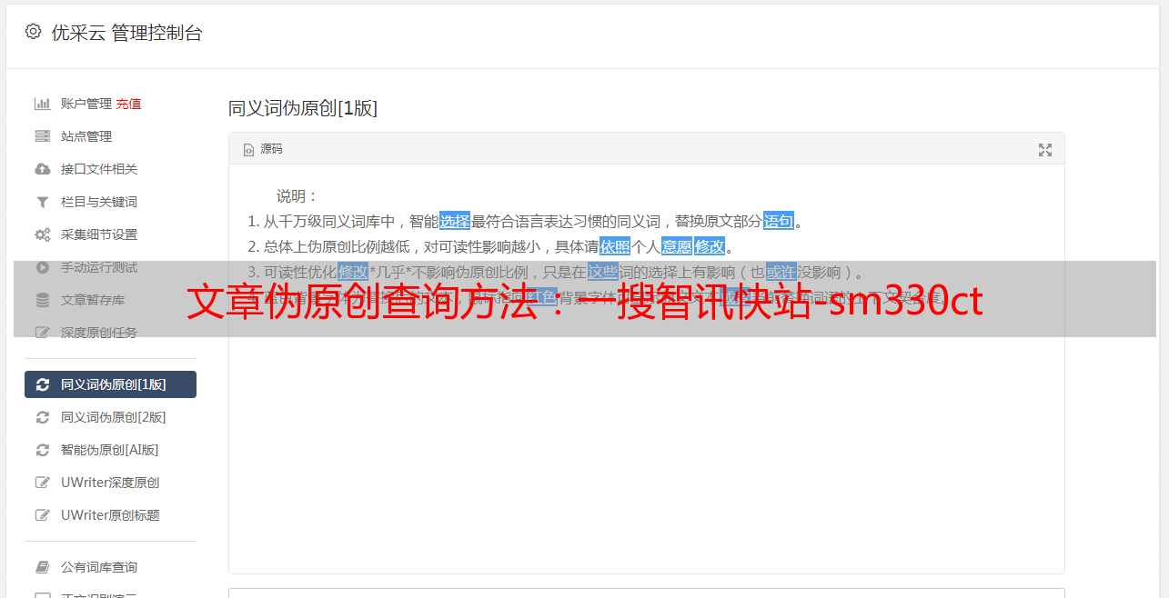 搜索智讯快站-sm330ct,就有详细的说明,还可以直接对接模板,这种模板也是提供了4种伪原创方法,直接去查询和修改,然后对接模板,一键伪原创,最终的效果是一样的,你所用的不同就是搜索的位置不同。