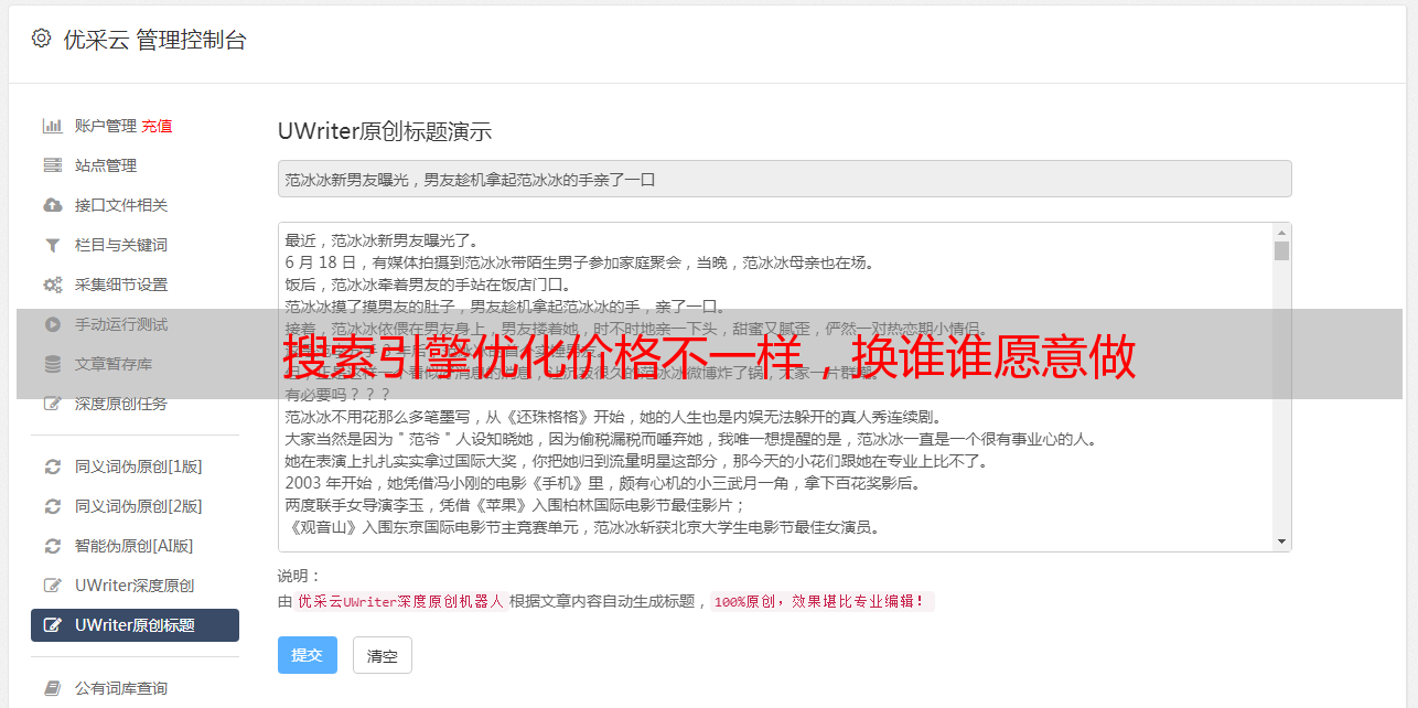 优采云 发布时间: 2022-07-10 08:00搜索引擎优化价格不一样,换谁谁愿意做