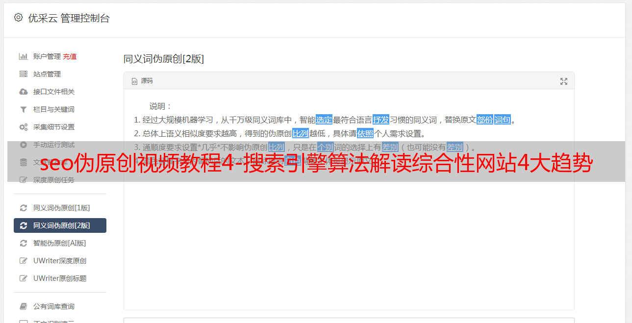 优采云 发布时间: 2022-07-10 19:06seo伪原创视频教程4-搜索引擎算法解读综合性网站4大趋势