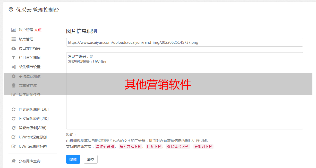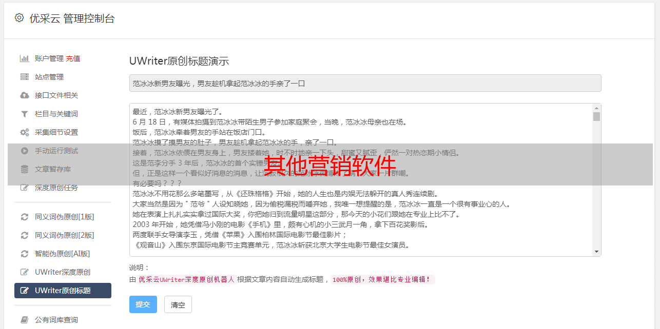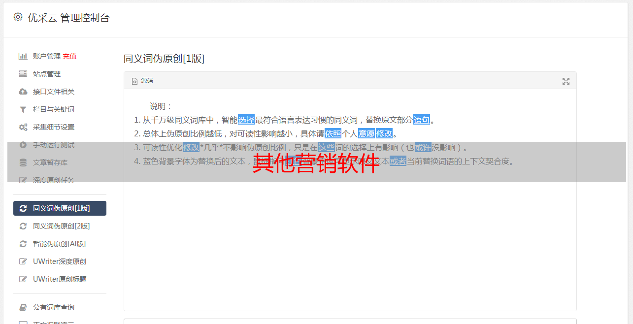 在原创文本可读性的前提下自动执行伪原创. 该系统具有唯一的同义词和反义词引擎,该引擎可以适当地更改文章的语义,并使用唯一的算法对其进行控制,以使每篇文章都接近原创文章. 所有这些操作均由系统自动智能完成,无需人工干预.