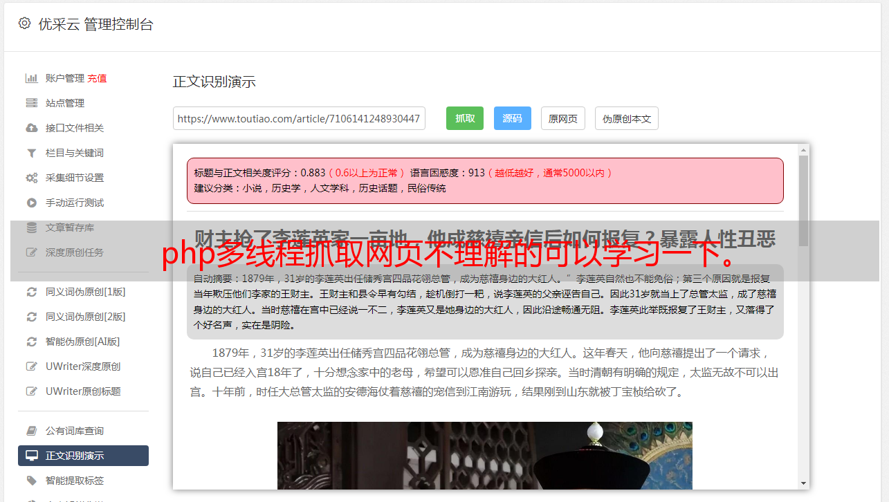 优采云 发布时间: 2022-07-24 19:01php多线程抓取网页不理解的可以学习一下。