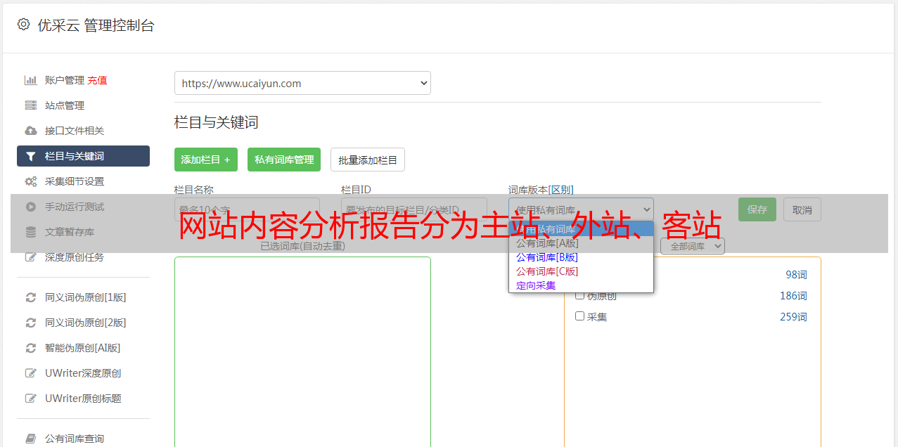 优采云 发布时间: 2022-07-27 13:01网站内容分析报告分为主站、外站、客站