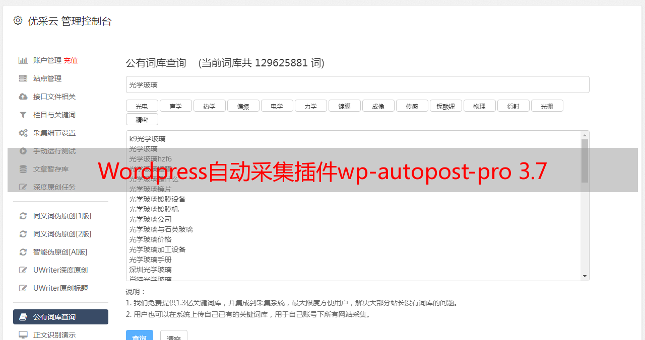 优采云 发布时间: 2020-08-07 02:19目前可以完美运行的WordPress版本,请随时使用它们. WP-AutoPost-Pro是一个出色的WordPress帖子采集器,它是一个功能强大的工具,可让您操作站组并让网站自动更新内容!如果您是新手,请查看采集教程:
