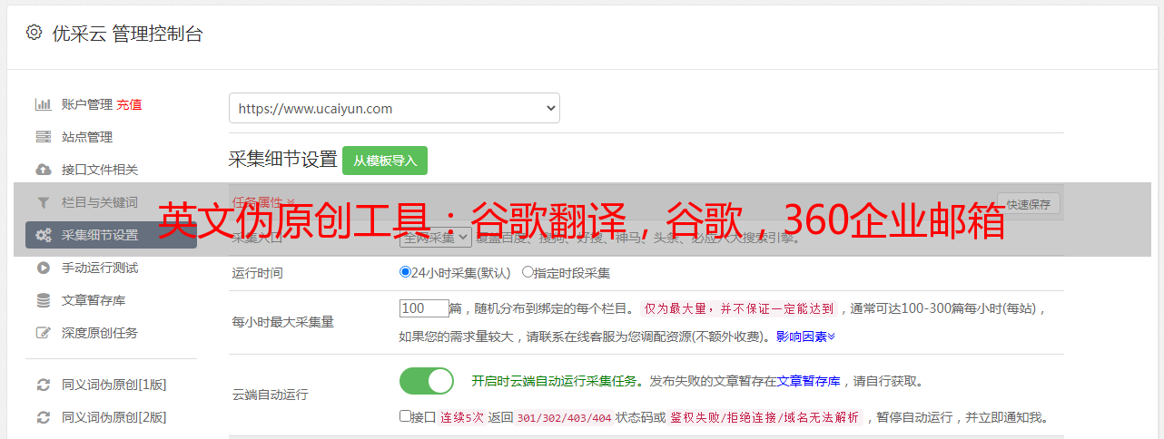 优采云 发布时间: 2022-08-06 06:06英文伪原创工具:谷歌翻译,谷歌,360企业邮箱