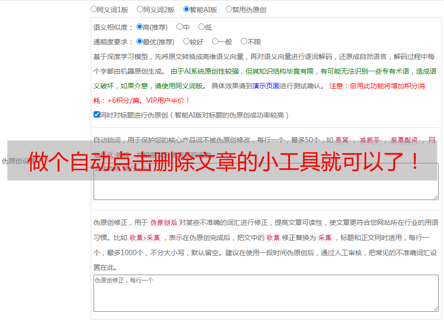 优采云 发布时间: 2021-05-23 22:25做个自动点击删除文章的小工具就可以了!