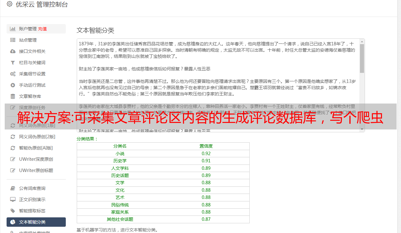 优采云 发布时间: 2022-09-23 13:05解决方案:可采集文章评论区内容的生成评论数据库,写个爬虫程序分析下呗