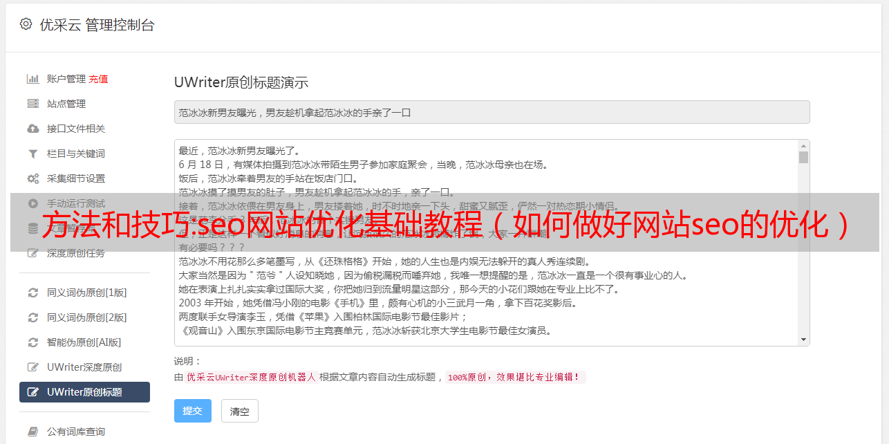 内容分为纯复制内容、纯原创内容和伪原创内容。当然,纯原创内容最受爬虫欢迎,但相对纯原创内容文章成本最高。所以一般情况下,大部分SEO人员都会选择伪原创文章,可以选择一些伪原创工具,比如5188,也可以针对一些相同的命题使用优质的工具Internet 上的 文章 被组合成一篇文章 伪原创文章。要知道,高质量的 伪原创 比普通的纯 原创 效果更好。