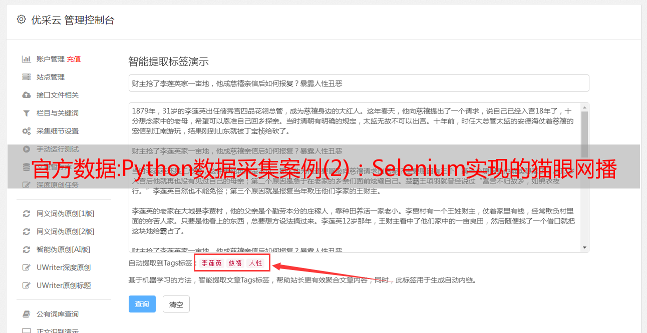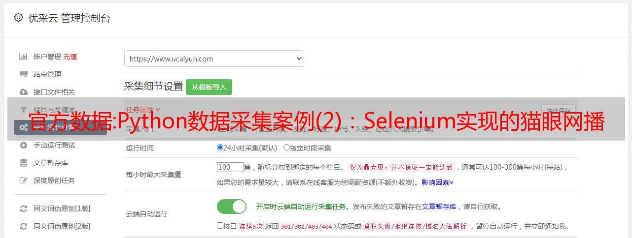 优采云 发布时间: 2022-09-29 23:15官方数据:Python数据采集案例(2):Selenium实现的猫眼网播热度采集