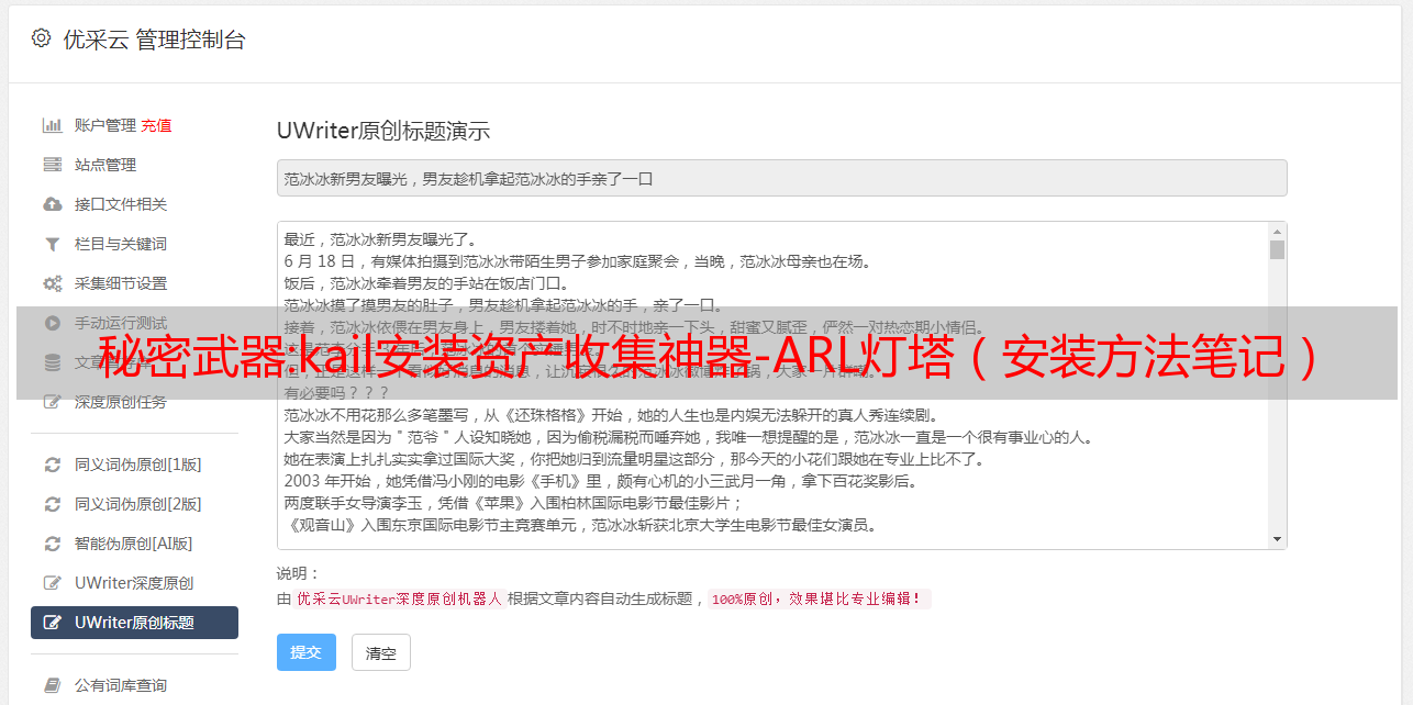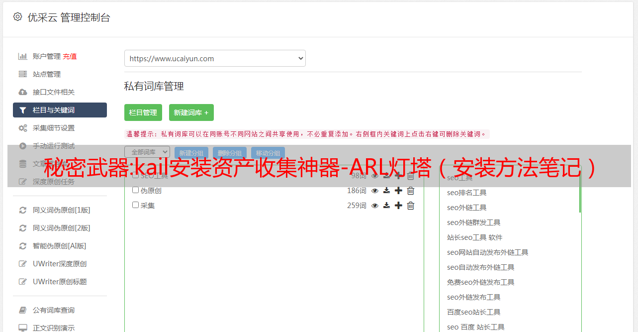 优采云 发布时间: 2022-10-01 17:09秘密武器:kail安装资产收集神器-ARL灯塔(安装方法笔记)