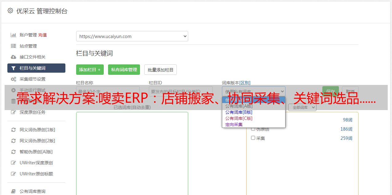 需求解决方案:嗖卖ERP:店铺搬家、协同采集、关键词选品......