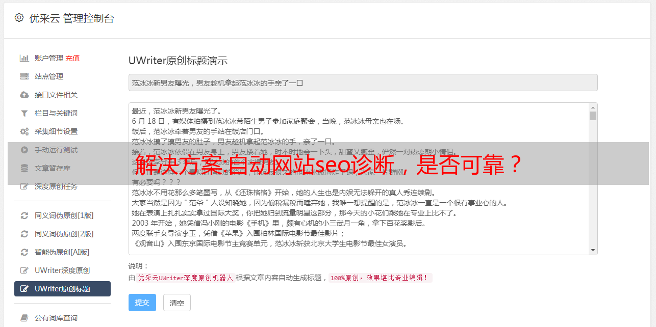 优采云 发布时间: 2022-10-04 11:13解决方案:自动网站seo诊断,是否可靠?
